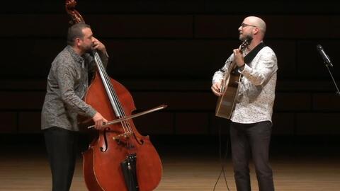 Qu'est-ce qu'un guitariste et un contrebassiste font quand il n'y a pas de soliste à accompagner? Ils deviennent eux-mêmes solistes! Connivence et musicalité, bref, un beau mélange ludique à souhait. Ces deux virtuoses de leurs instruments acoustiques propulsent leur complicité harmonieuse et dynamique vers un public toujours ravi. Sur des couleurs de jazz et de folk progressif, la guitare de Simon Proulx et la contrebasse d’Étienne Lafrance sont en osmose.